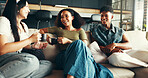 Bonding, women and friends with coffee, home and listening to gossip, couch and drinks in living room. Happy, conversation and relax in lounge, tea and together in weekend, talking or people in house