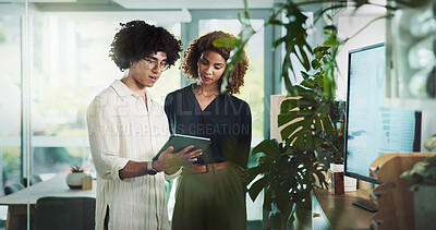 Stock Photo - Man, woman and tablet in discussion at startup with board, stats and brainstorming with charts with sustainability. People, partnership and touchscreen with app, synergy and climate consulting agency