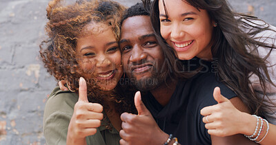 Stock Photo - Hip hop, portrait and thumbs up with dance crew outdoor together on wall background for motivation. Artistic, creative or success with happy man and woman friends in city for performance rehearsal
