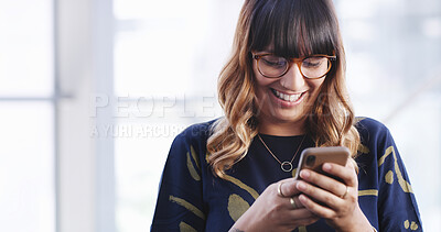 Stock Photo - Office, businesswoman and laughing with smartphone for chat, online communication and web for blog. Workplace, female person and consultant with mobile for service application, networking and smile