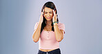 Stock Photo - Woman, portrait and finger with hush, studio and silence for mystery announcement mockup. Model, gossip and secret with rumor, whisper and gesture for news or noise with privacy on grey background