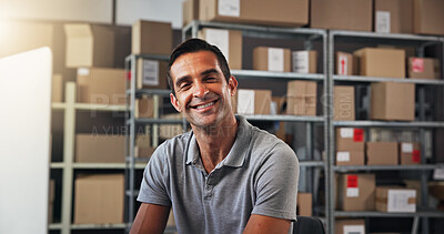 Computer, portrait and supply chain with man in distribution center for schedule or stock update. Boxes, logistics and smile with courier employee in office for delivery, ecommerce or shipping - Stock Photo