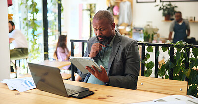 Stock Photo - Thinking, business and tablet with man in cafe for reflection, remote worker and research. Planning, client feedback and vision with male person and laptop in coffee shop for future, idea and update