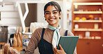 Stock Photo - Tablet, phone call and update with woman in cafe for inventory checklist, restaurant stock order and small business. Hospitality, store and menu planning with person in coffee shop for barista sales