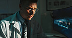 Stock Photo - Science, computer and man in lab at night for medical research, innovation and vaccine development. Healthcare, pharmaceutical and scientist on laptop for medicine, breakthrough and discovery
