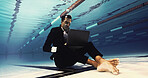 Stock Photo - Swimming pool, handrail and sports facility with safety, event and wellness center for community. Empty, balance and water with bars for secure grip, accessibility and enter with exit or mobility