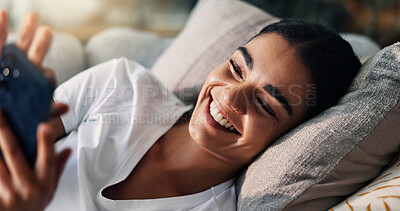 Stock Photo - Woman, happy and relax with phone on sofa for weekend break, dating site chat or reading ebook. Smile, person and resting with smartphone in home for online subscription, social network or web scroll