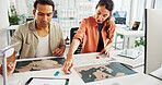 Meeting, sustainability and business people on computer in office for project, research and planning. Discussion, thinking and man and woman on pc for wind turbine, electricity and renewable energy