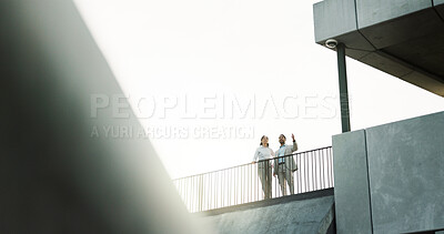 Stock Photo - Pointing, rooftop and teamwork with business people outdoor for meeting or planning. Building, city and property development with agent speaking to client for commercial infrastructure or investment