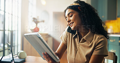 Stock Photo - Woman, phone call and tablet for remote work from home in kitchen for talk, solution or smile for review. Person, virtual assistant and happy on smartphone, app or check for notes, agenda or deadline