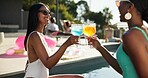 Cocktail, lemon and swimming pool with sunglasses and alcohol for summer holiday or vacation. Travel, resort and drink by water for outdoor luxury, hotel hospitality and break to relax by space