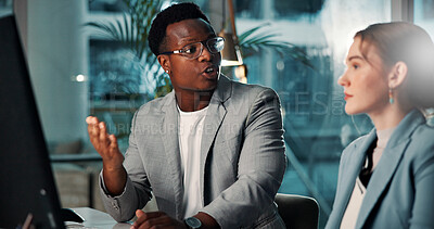 Stock Photo - Business people, computer and team planning at night for project deadline, insurance or risk management. Meeting, brainstorming and discussion in office for financial coverage, policy or conversation
