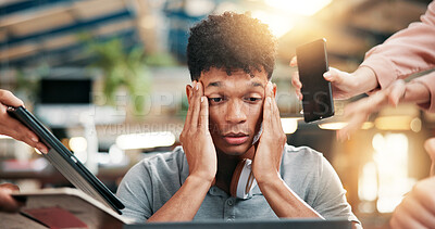 Stock Photo - Frustrated, businessman and multitasking with project deadline or demanding employees at office. Man, chaos and overworked with stress, anxiety or overwhelmed for colleague workload at workplace