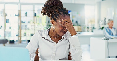 Stock Photo - Frustrated, business woman or headache with stress on laptop for pressure or eye strain at office. Female person, accountant or tired employee with migraine on technology for project deadline or fail