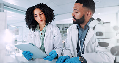 Stock Photo - Scientist, woman and man with tablet at lab for review, results and check progress for pharmaceutical study. People, partner and digital touchscreen on app for clinical trial with medical research