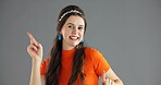 Portrait, smile and woman with peace sign in studio for retro fashion on gray background space. Happy, hand gesture and person with v symbol for victory, achievement emoji or winning with success
