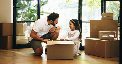 Stock Photo - Boxes, excited or moving in with dad and daughter in new home for property or real estate investment. Family, growth or relocation with single parent man and girl child in apartment for mortgage