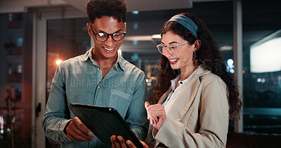 Stock Photo - Business, people and tablet in office at night for investment news, review currency price or market research. Trader, happy or overtime with digital app for trading deadline, stocks account or profit