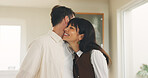 Stock Photo - Breakfast, orange juice and smile with happy family in dining room of home together for meal or nutrition. Beverage, food or morning with mom, dad and daughter in apartment for diet, health or hunger