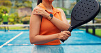 Fitness, portrait or athlete on tennis court with arms crossed, sportswear or performance goal in hobby. Padel, muscle or woman outdoor with confidence, challenge or health for body transformation. - Stock Photo