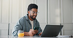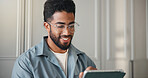 Home, above and man on couch, smartphone and online reading with communication. Cellphone, relax and person with happiness, email notification and connection with internet, app and message to contact