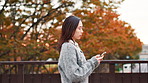 Stock Photo - Japanese, woman and late outdoor on park bridge with phone checking for time and rush to job in city. Urban, professional and Tokyo with run for appointment and work schedule in morning and autumn