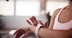 Woman, gym and check fitness on smart watch, cardio statistics and results of workout on app. Exercise, person and monitor health information on website, progress update and tracking target time - Stock Photo