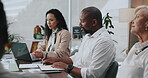 Stock Photo - Business people, handshake and applause in office, teamwork and thank you to client in meeting. Agreement, employees and collaboration in workplace, partnership and clapping for onboarding support