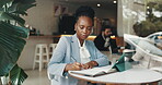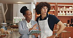 Tablet, man and waiter in coffee shop for inventory checklist online for order with supplier. Stock, restaurant and male barista with digital technology for website update with menu in cafeteria. - Stock Photo