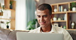 Stock Photo - Happy man, laptop and online shopping with credit card for banking app, remote payment or transaction at home. Male person, shopper or user with computer or debit for ecommerce or fintech at house