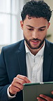 Stock Photo - Tablet, scroll and reading with business woman in office for investment app, client portfolio and planning. Account review, banking advisor and report with person in agency for schedule and online