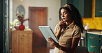 Stock Photo - Headache, student and woman with laptop, home and stress for deadline of assignment or scholarship. Education, pain and person with migraine for exam, thinking and anxious for project, online or dorm