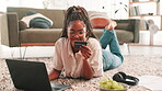 Happy, woman and relax with phone at house for communication, social media and reading blog. Female person, mobile app and texting for feedback, weekend chill and message update with notification - Stock Photo