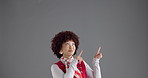 Face, smile and woman in studio for fashion, vintage style or makeup on gray background. Portrait, happy model and trendy clothes with retro outfit, aesthetic or confidence with mockup space in USA - Stock Photo